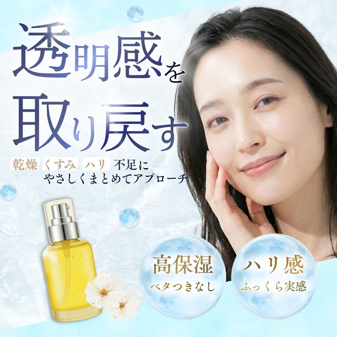 ・「潤い」「ハリ感」を直感的に連想できるよう水滴やグラデーションのある円、光の表現と実際の美容液を配置しました。